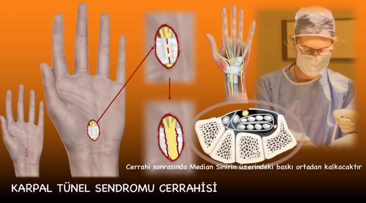 El bileğimizin içerisinde, el parmaklarımızın hissini ve başparmağımızın sıkma kuvvetini ileten bir sinir bulunmaktadır. Bu sinire “Median Sinir” denilmektedir. Herhangi bir sebeple median sinirin, el bileğinde geçtiği tünel içerisinde sıkışmasıyla ortaya çıkan hastalığa “Karpal Tünel Sendromu” adı verilmektedir. Sinirin baskı altında kalması nedeniyle, özellikle başparmaktan yüzük parmağına kadar olan parmaklarda uyuşma, ağrı ve el sıkma gücünde bir zayıflama ortaya çıkacaktır. Üç (3) aydan uzun süren karpal tünel sendromu hastalığında, sinirin bası altında kalmasına bağlı olarak hasarın ilerlememesi ve kalıcı olmaması için cerrahi tedavi gerekli olacaktır. Ameliyat genel veya bölgesel anestezi altında yapılabilir. Cerrahi esnasında turnike adı verilen bir cihaz kullanılarak, ameliyatın kansız bir şekilde yapılması sağlanacaktır. Yaklaşık 3 (üç) cm’lik bir kesi kullanıldıktan sonra, median sinirin üzerindeki bilek zarı açılarak “Median Sinir” rahatlatılacaktır. Bu işlem sonrasında bası altındaki sinir adeta nefes alacaktır.