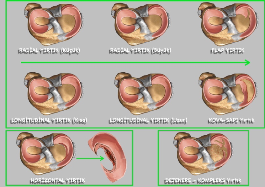 Erken yaşlarda dizin ters hareketi sonrasında menisküs dokusunun bütünlüğünün bozulabilir, yani yırtılabilir. İleri yaşlarda ise basit bir hareketle, zorlanma olmaksızın, esnekliğini kaybetmiş olan menisküs dokusu yırtılabilir. Menisküslerin çok önemli fonksiyonları olduğu için, yırtıldıkları zaman öncelikle tamir yoluyla bütünlüklerinin tekrardan sağlanması önerilir. Bununla beraber, ne yazık ki bütün menisküs yırtıkları tamir edildikleri zaman iyileşmezler. İleri yaşlarda görülen menisküs yırtıkları sıklıkla tamir edilmeye uygun olmayan yırtıklardır. Erken yaşlarda görülen menisküs yırtıklarının da bir kısmı tamir edilmeye uygun değildir.