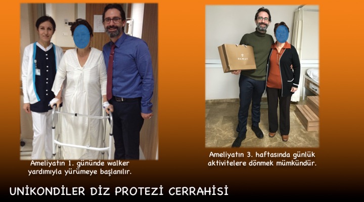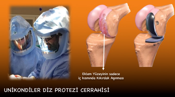 Unikondiler diz protezi ameliyatı, eklem yüzeyinin sadece hastalıklı iç kısmının temizlendiği ve yerine rahatlıkla harekete izin veren, yeni bir eklem yüzeyine kavuşacağınız bir ameliyattır. Ameliyat öncesinde bacaklarınız özel olarak temizlenerek ameliyata hazır hale getirilecektir. Turnike cihazı isimli bir cihaz kullanılarak, ameliyatın hiç kanama olmadan gerçekleşmesi sağlanacaktır.